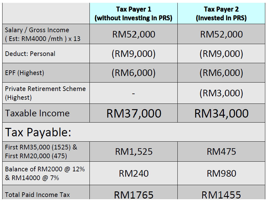 Contoh penjimatan Skim Persaraan Swasta terhadap cukai pendapatan adalah seperti dibawah: